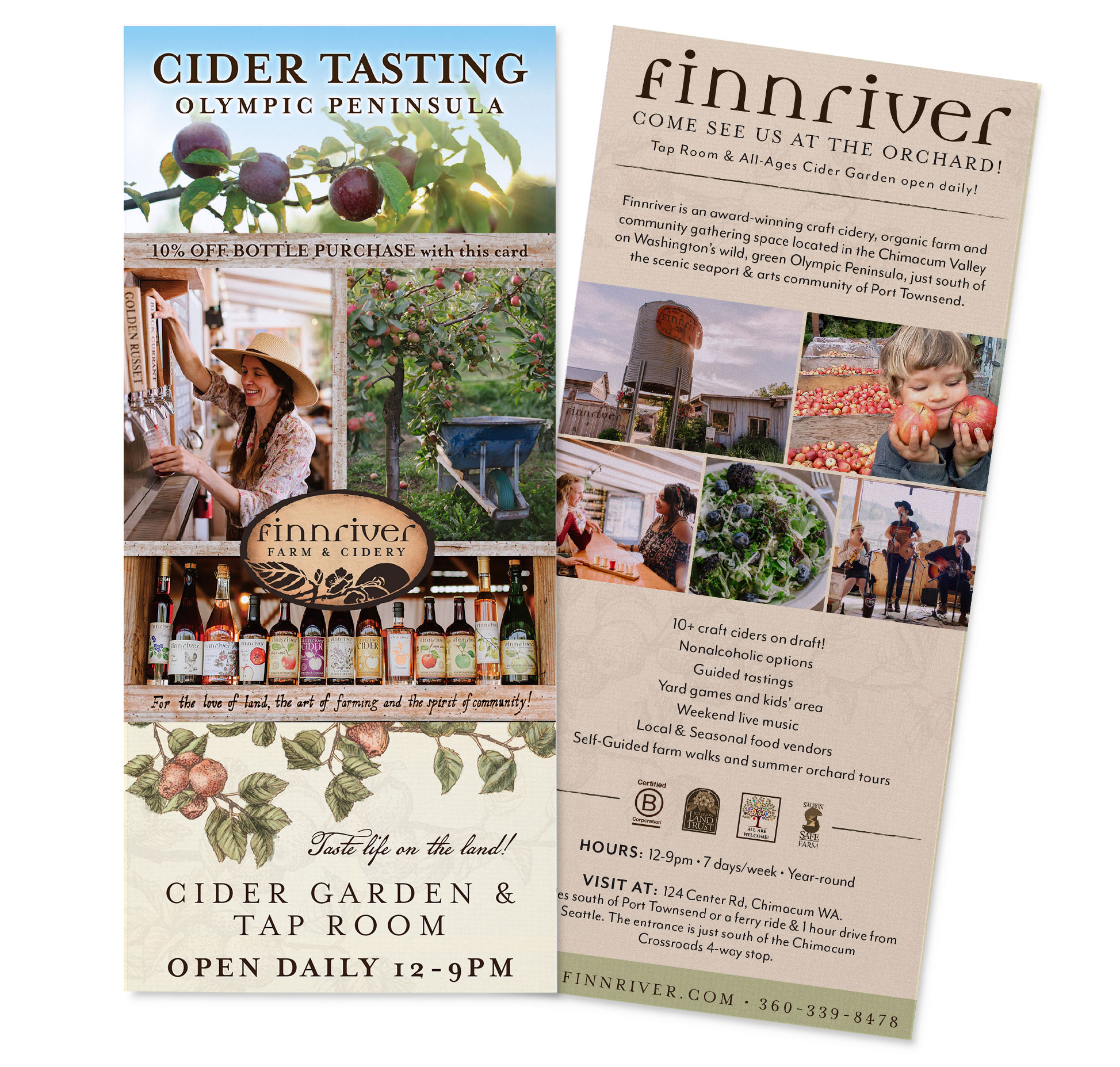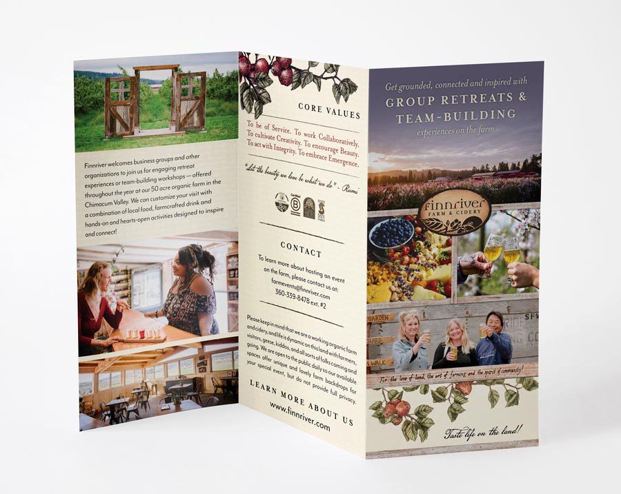 Utilizing a font that is simple yet elegant paired with hand drawn pen & ink artwork, I created a brand that represents the care and unique hand-crafted art of Finnriver. The brand is evident in everything they present to the world — their cidery and gift shop, marketing materials, and website. Across the board, customers will see unique, hand-crafted art in gentle earth tones that represents the essence of the farm, its staff and the Finnriver community mission.PRINT MARKETING